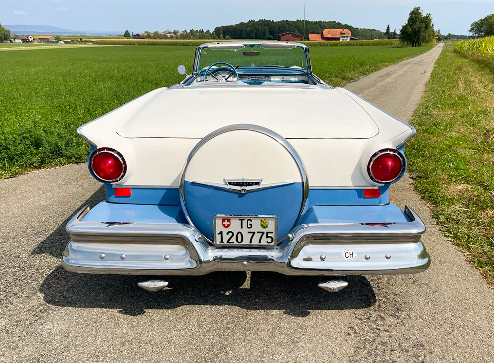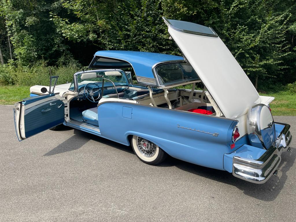 Der Ford ist eine Revolution mit seinem stählernen Cabrioverdeck, das sich automatisch versenken lässt und das im Jahre 1957. Der Ford hat eine Länge von 6.08 und wirkt imposant auf der Strasse.